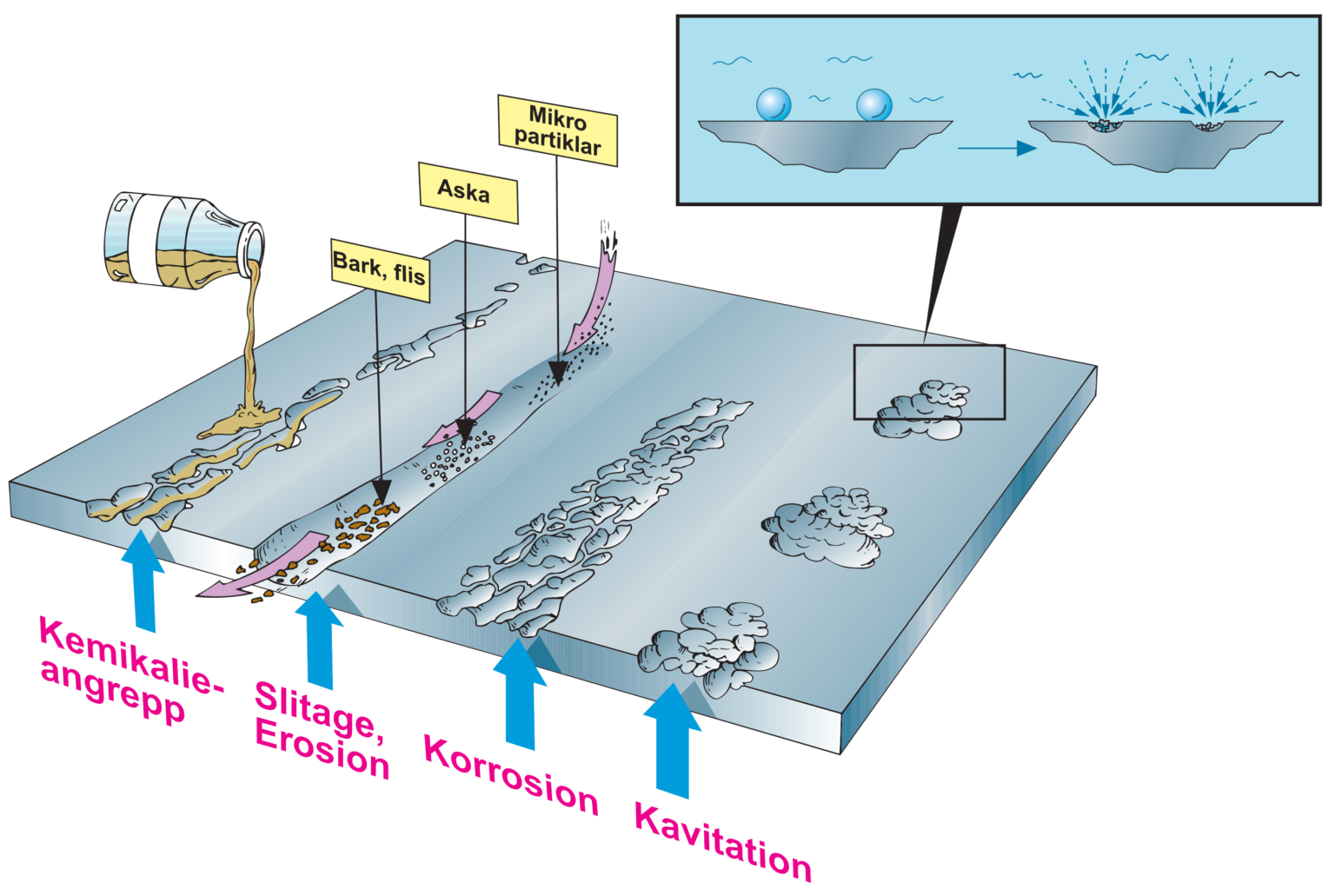 Metallbilden visar de vanligaste skadorna som uppstår på metall och orsakerna kan vara bl.a kemikalieangrepp, korrosion, erosion, slitage och kavitation.